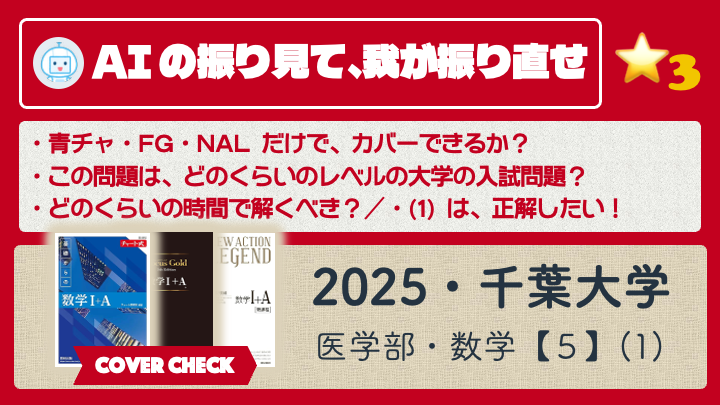 ◆ 千葉大学|医学部|数学 ・第5問の解説| 第6問の解説| 第7問の解説| 第8問の解説| 第9問の解説 |