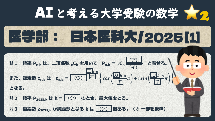 ◆ 日本医科大学|医学部|数学 ・第1問の解説| 第2問の解説(※ 準備中)| 第3問の解説(※ 準備中)| 第4問の解説(※ 準備中) |