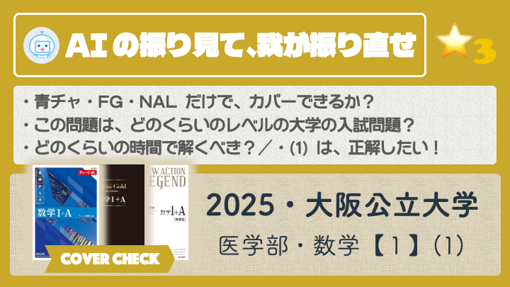 ◆ 大阪公立大学|医学部|数学 ・第1問の解説|小問(1)| 小問(2)| 小問(3)| 第2問の解説(※ 準備中)| 第3問の解説(※ 準備中)| 第4問の解説(※ 準備中)| 第5問の解説(※ 準備中) |