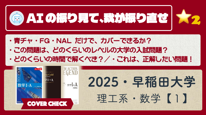 | ◆ この解説動画シリーズの目的は、過去の入試問題に対して、各教科の有名な問題集だけでカバーできるか、 または、できない場合に、どのような応用が必要であったか、などについて、検証・研究することにあります。 | |